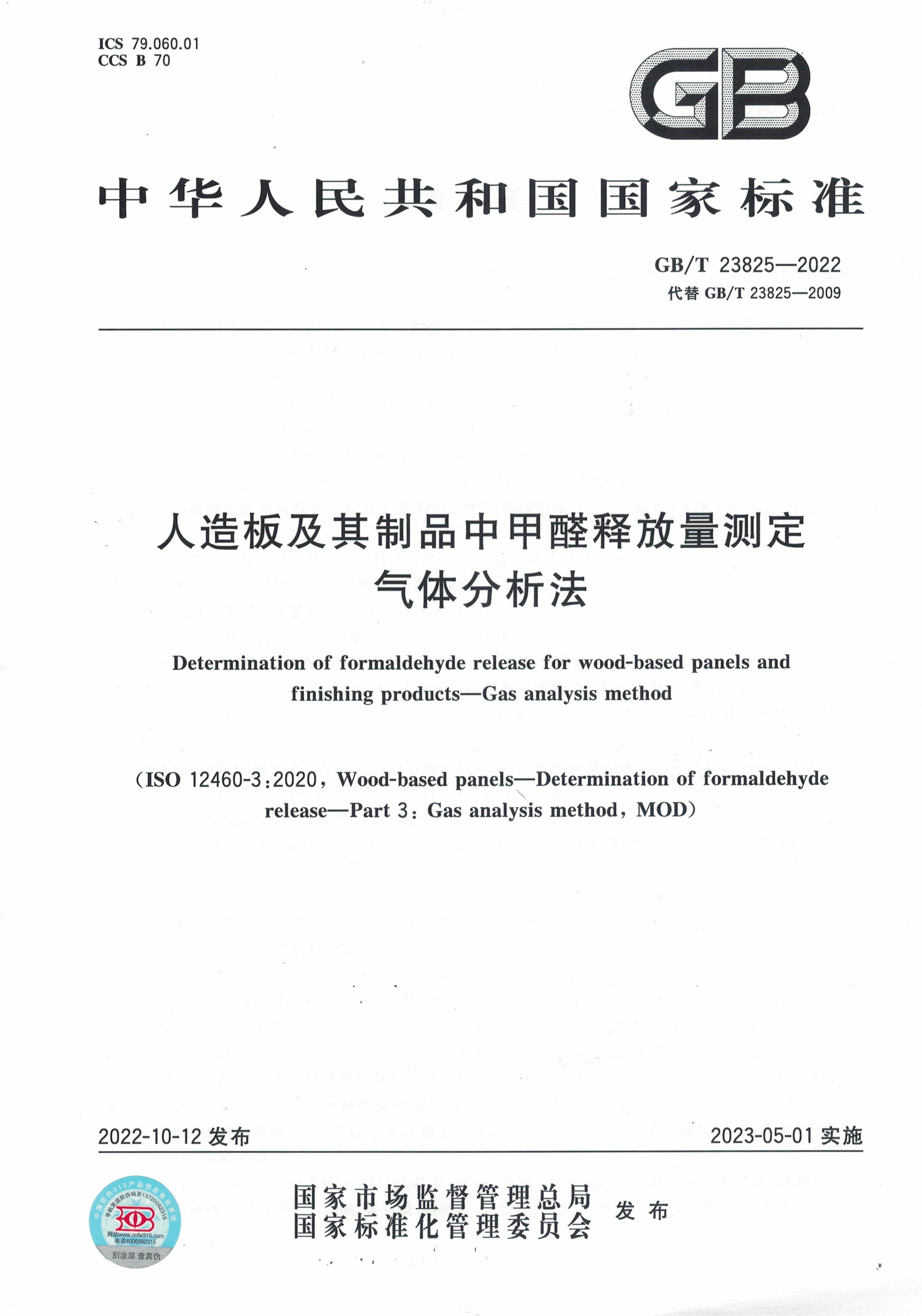 GB/T 23825-2022《人造板及其制品中甲醛釋放量測(cè)定 氣體分析法》正式發(fā)布了,并將于2023年5月1日起實(shí)施。新標(biāo)準(zhǔn)實(shí)施后,將代替GB/T 23825-2009。